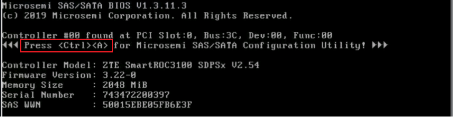 在BIOS启动阶段,按CTRL+A组合键,进入RAID卡配置界面,如下图所示。