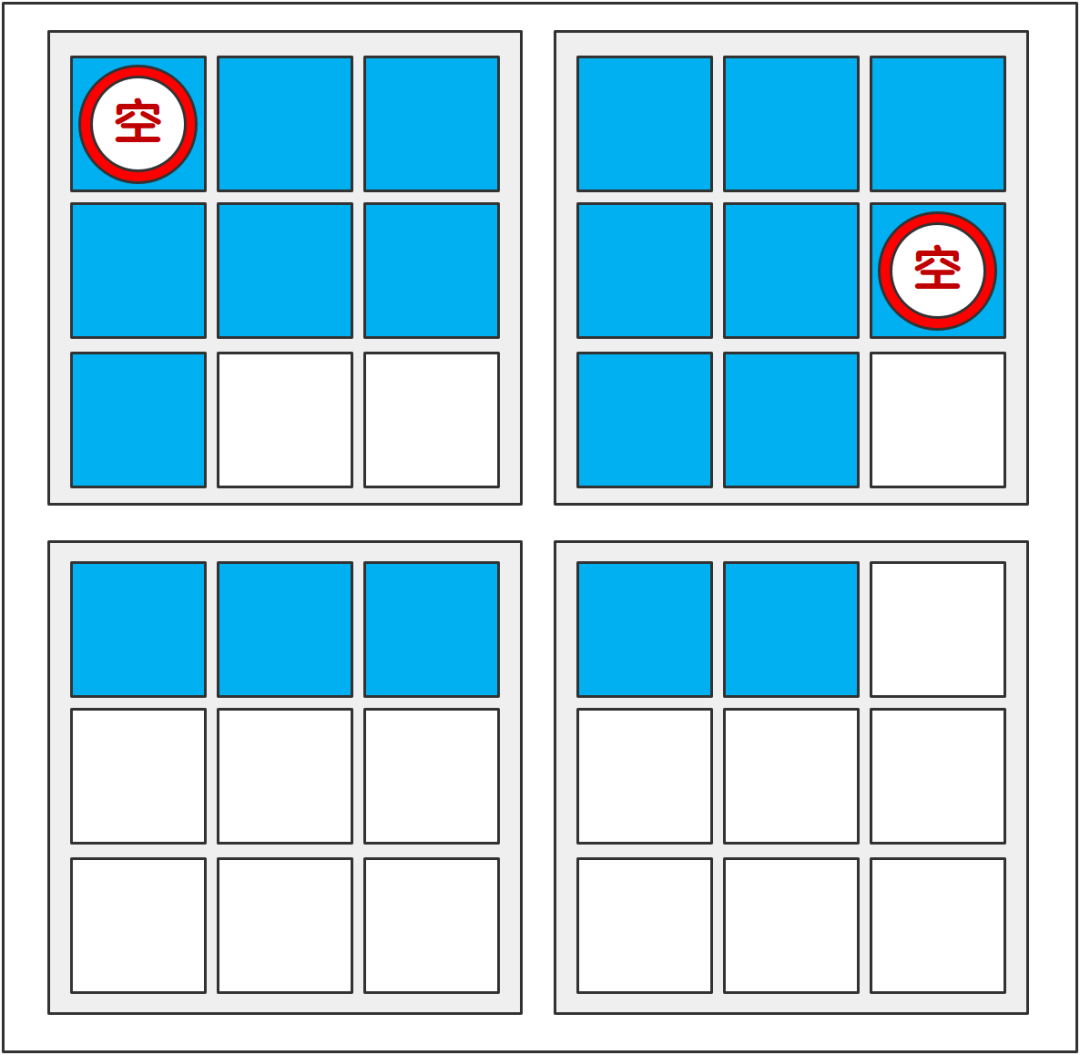 为了便于理解,我们用这些小格子代表闪存的单位存储空间,其中白色的格子表示空白的存储空间,蓝色的格子表示已存有数据的存储空间。用小格子组成的灰色区域表示一块储存区域。