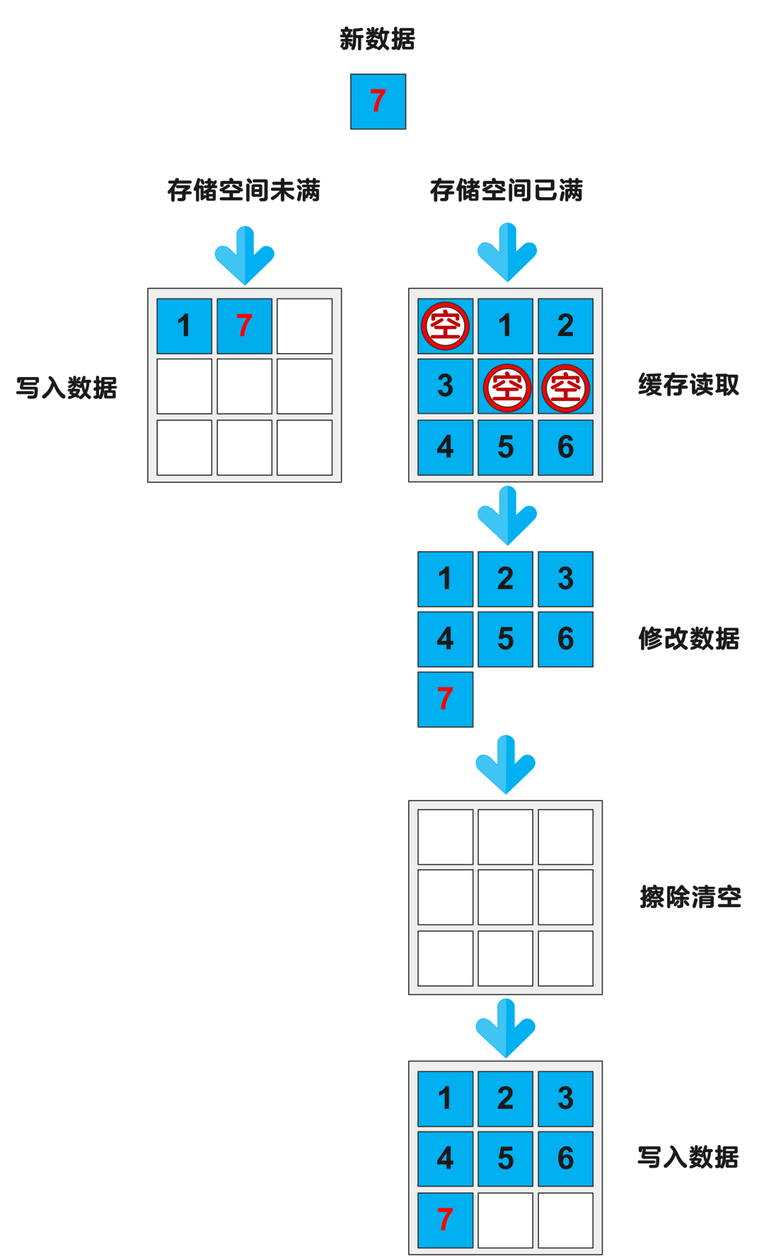 当要写入一个的数据“7”时,最坏的情况是一个块里已经没有干净的格子了,但是其中无效的数据(标记为“空”)能够擦除,所以要把全部的数据都读到缓存,擦除区域内里的所有数据,再把新数据写进去。