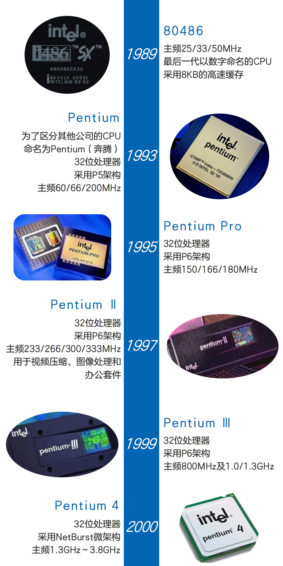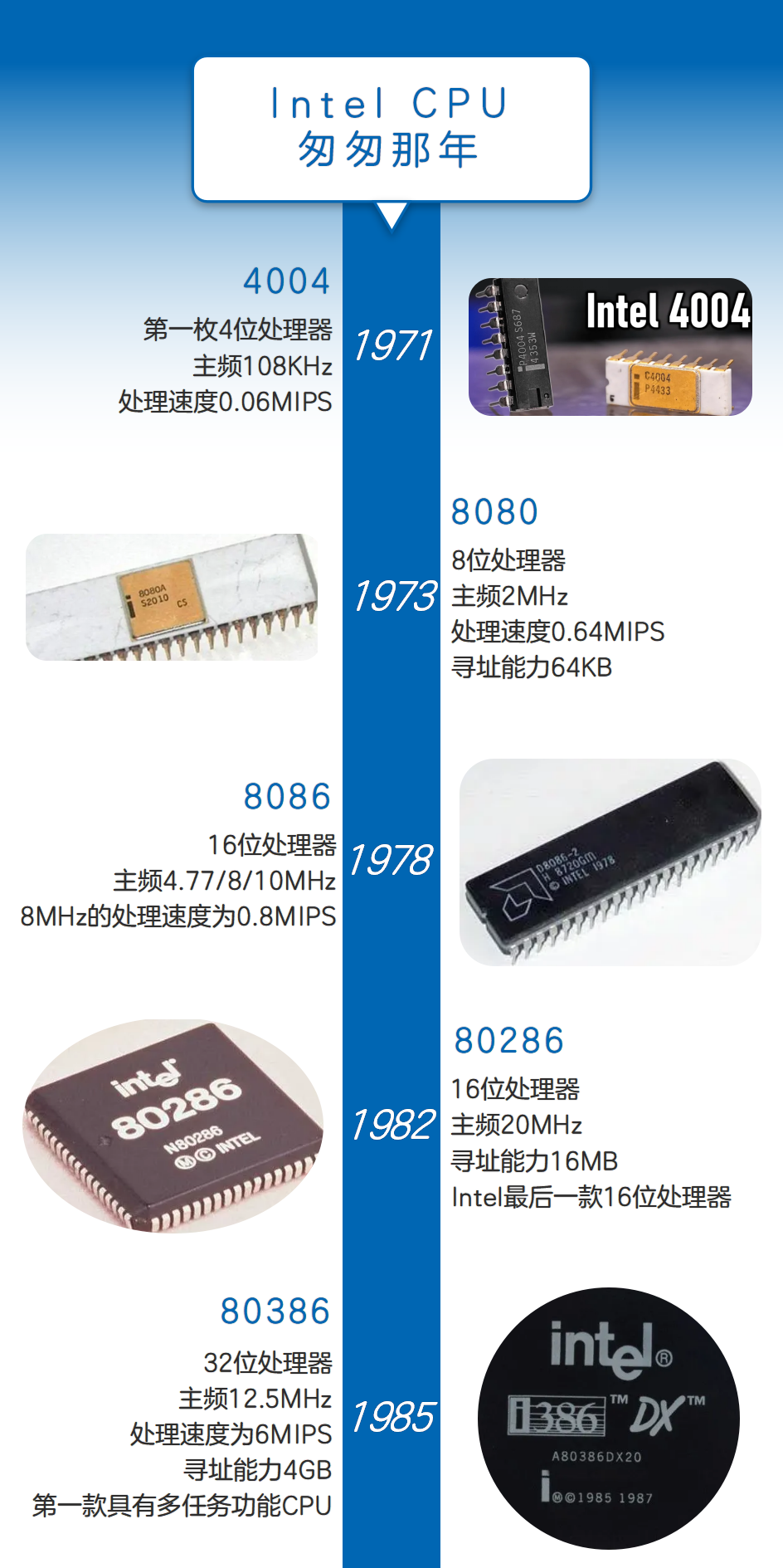 Intel公司创始于1968年,是生产CPU的老大哥,它占有大约80%的市场份额,先来看看Intel CPU的匆匆那年吧。