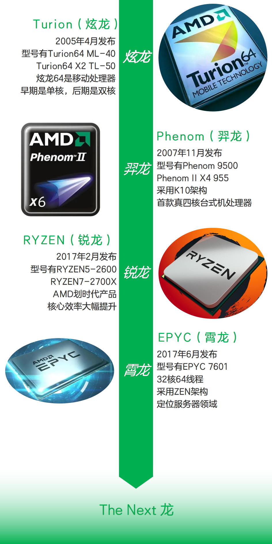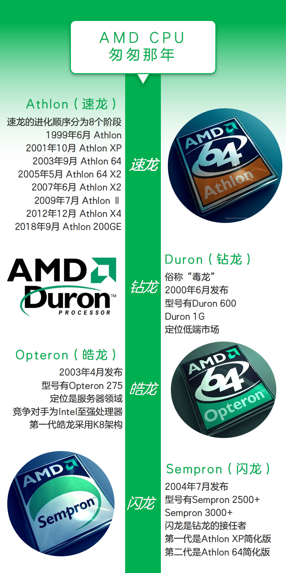 1999年以来,AMD公司喜欢以“龙”来命名CPU,目前一共发布了8条龙:速龙、钻龙(毒龙)、皓龙、闪龙、炫龙、羿龙、锐龙、霄龙。