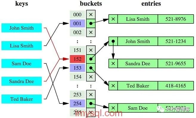 在MySQL中,只有Memory引擎显式支持哈希索引。而当使用了哈希索引时,对于每一行数据,存储引擎都会对所有的索引列计算一个哈希码,由于哈希查找比起B-Tree索引,其本身对于单行查询的时间复杂度更低,为常数级O(1),有了哈希索引后明显可加快单行查询速度。不过缺点是,哈希索引无法用于排序,只支持等值比较查询,不支持部分索引列内容的匹配查找,不支持任何范围查询,例如where price > 100。而且如果哈希冲突很多的话,一些索引维护操作的代价也很高。所以哈希索引一般适用于不需要做排序和范围查询的需求场景。一个哈希索引样例: