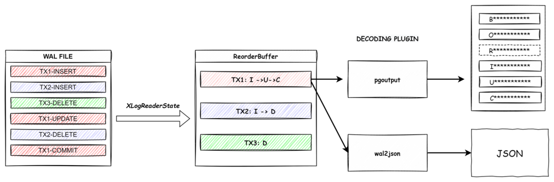 当我们了解了概念之后,来看一下整个解析的工作流程。由于WAL文件里一个事务的内容并不一定是连续的,所以需要通过Reorder后放在buffer中,根据事务ID组织成一条消息,COMMIT后发送给输出插件,输出插件解析后将消息流发送给目标端。