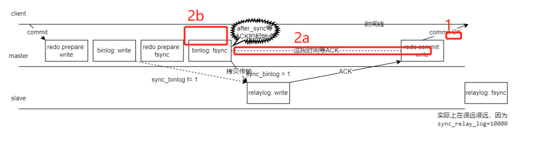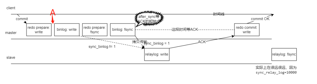 用户在 client 处执行 commit 提交了事务,主库写入了 redo 文件,对应"redo prepare: write" binlog: write—— master 节点写入 binlog 文件。 redo prepare: fsync—— 传说中的两阶段提交的第一阶段 prepare 刷盘(从 OS 层 page cache 持久化刷新到硬盘)了。 binlog: fsync—— binlog 刷盘。 拷贝 binlog 到 slave 写入到 relaylog 文件,写完则返回 ACK 给 master 节点,表示收到这个 binlog 了,relaylog 根据参数 sync_relay_log=10000