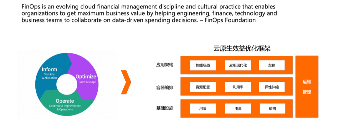今天数字化的生产与生活方式成为后疫情时代的新常态,云计算也已经成为社会的数字化基础设施。如何利用云原生技术帮助企业实现降本增效是很多 IT 管理者和开发者关注的话题。阿里云容器产品 ACK 覆盖了从公共云、边缘云、到本地数据中心的各个场景,让所有需要云能力的地方,都能获得统一的容器基础设施。容器服务 ACK 支持了外部数万企业客户 IT 架构的容器化,优化上云成本,提升用云效率,同时 ACK 也是很多阿里云产品的基础设施,支撑云产品的 Serverless 化。比如阿里云上消息服务、RDS 数据库、数据湖分析、弹性 AI 服务等等。同时容器服务也支撑了阿里集团的全面云原生化,目前规模已达到数千万核。站在经济学角度,云计算是将 IT 的固定成本转化成为可变成本,这对企业传统的 IT 成本管理方法也带来了挑战。于是 FinOps 理念也应运而生。在 FinOps 基金会的定义中:FinOps 是一种不断发展的云财务管理科学与实践,通过数据驱动的支出决策帮助工程、财务、技术和业务团队进行协作,使组织能够获得最大的业务价值。FinOps 是“Finance”和“DevOps”的综合体,强调业务团队和工程团队之间的沟通与协同。在 FinOps 实施过程中我们可以将其划分为:成本洞察、成本优化、成本运营三个阶段,帮助企业通过数字化手段实现成本可视,可优化与可控。利用云原生技术实现上云效益优化,可以从几个层次入手:- 用法 – 选择合适的算力适配工作负载,比如对高性能计算等场景,选择计算型实例,或者利用 GPU、RDMA 等加速设备实现降本提效。