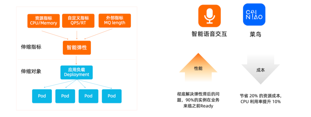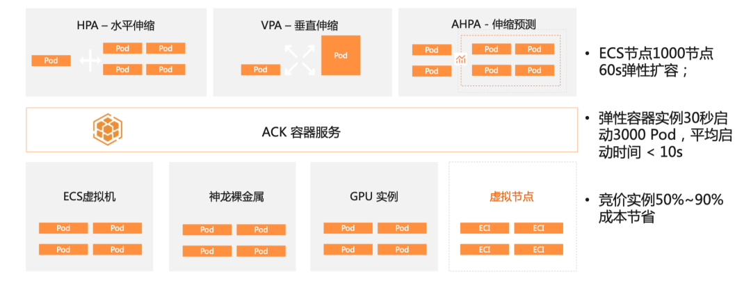 在容器编排层,我们关注在分布式集群上,让应用更加稳定、高效地运行,并充分利用云的弹性能力降低成本。在应用架构层,我们既需要解决架构中的性能瓶颈,也需要关注应用架构的现代化,并将稳定性、可观测性、安全等在研发流程左移,实现应用生命周期中的成本效率优化。今天我会将聚焦在容器编排中的智能弹性、任务混部与数据加速等几个方面介绍如何实现成本优化和效率提升。弹性是云最核心的能力之一,可以有效降低计算成本,ACK 在资源层和应用层提供了丰富的弹性策略。在资源层,当 K8s 集群资源不足时,ACK 集群可以利用 cluster-autoscaler 在节点池中自动创建新的节点实例。ACK 可以根据应用负载,选择 ECS 虚拟机、神龙裸金属实例进行扩容。基于阿里云强大的弹性计算能力,可以在分钟级实现千节点扩容。在 ACK 集群中一个更加简化的方案是利用 ECI 弹性容器实例来实现弹性。ECI 基于轻量虚拟机提供了 Serverless 化的容器运行环境,具备强隔离、高弹性、免运维、免容量规划的特性。弹性容器实例可以在 30 秒内扩容 3000 Pod,新浪微博利用 ECI 可以轻松应对突发的新闻事件;自动驾驶模拟仿真客户可以在 1 分钟内拉起数万核算力进行计算。值得一提的是,我们可以使用 ECS 或者 ECI 的竞价实例,利用阿里云的空闲计算资源,成本折扣可以低至按量付费实例的 90%。竞价实例非常适合无状态和容错性好的应用,比如批量数据处理或者视频渲染等。在应用层,Kubernetes 提供了 HPA 的方式进行 Pod 的水平伸缩,和 VPA 进行 Pod 的垂直伸缩。ACK 还内建了基于机器学习的 AHPA 方案来进一步简化弹性体验,提升弹性的 SLA。