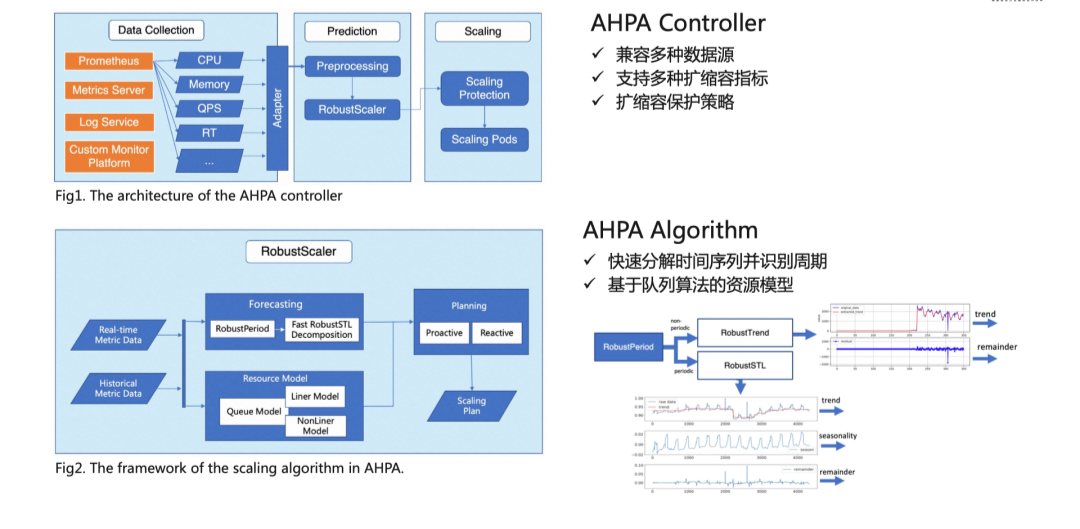 CronHPA 是用户根据业务的周期性设定定时规则,在指定时间进行实例数伸缩,结合 HPA 可以在业务高峰期到来之前完成扩容,具备很好的确定性。它的缺点是手动设定较为复杂。为此,达摩院团队和阿里云合作提出了一种智能化弹性伸缩方案 AHPA,可以根据历史时序数据进行主动预测,提前扩容,避免弹性滞后。并且会根据实时数据动态调整主动预测结果,兼容周期变动等场景,减少人工干预。AHPA 整体架构如图 1 所示,分为数据采集、预测及弹性伸缩三大部分。- Data Collection 模块负责从数据源收集监控 Metrics 指标并将数据转为统一的格式传入给 Prediction 模块,兼容多种数据源,支持多种扩缩容指标。