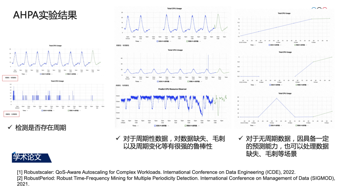 • 当数据不存在周期性时,AHPA 因具备一定的预测能力,可以提前感知数据趋势变化;对数据丢失、噪音等有很强的鲁棒性; AHPA 相关论文也被 ICDE、SIGMOD 等顶会收录。