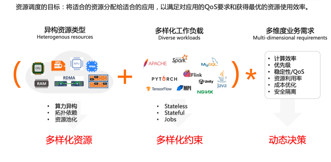 - 对多维度业务需求的支持。调度系统在满足应用对资源需求的同时,也要满足不同的业务需求,比如计算效率、优先级、稳定性、利用率等等。