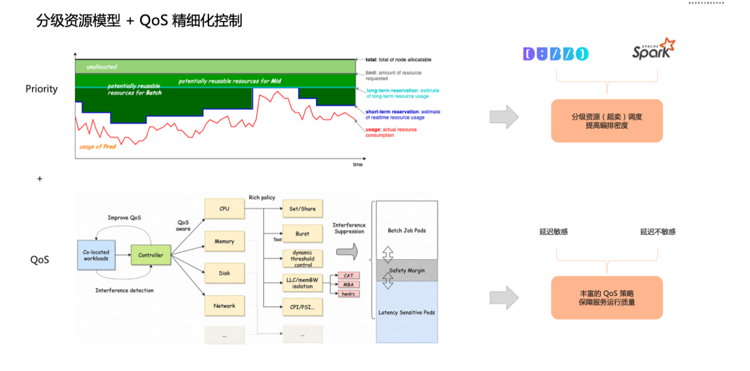 Koordinator 可以让类似 Dubbo 微服务这样的延迟敏感应用与 Spark 任务这样的批处理计算任务可以同时运行在一个集群中,从而提高集群的资源利用效率。Koordinator 提供了若干预定义的 QoS 类别,用于区分延迟敏感业务和延迟不敏感业务对运行时资源的差异化需求。Koordinator 通过资源画像算法预测,可以将高优先级应用已分配但尚未使用的资源,超售给低优先级的计算任务。这样可以将节点资源的分配率提高超过 100%。如何保障资源超售场景下的应用稳定性是其中最大的挑战。在运行态,Koordinator 节点侧组件结合 CPU 微架构、OS、容器等多维度的资源隔离、干扰检测、干扰抑制等手段,让低优先级的任务对延迟敏感型任务的影响 < 5%。这里面会利用操作系统内核 cgroup的一部分能力;也针对新一代云原生芯片进行优化。比如,通过 CPU 微架构的精细化拓扑感知,优化进程排布,提升缓存命中率,降低跨 NUMA 内存访问等。在 Intel 芯片之上,我们可以通过引入 RDT、HWDRC 等技术可以根据用户应用的 QoS,动态调整 L3 缓存带宽,降低由于内存带宽争抢导致的性能波动。