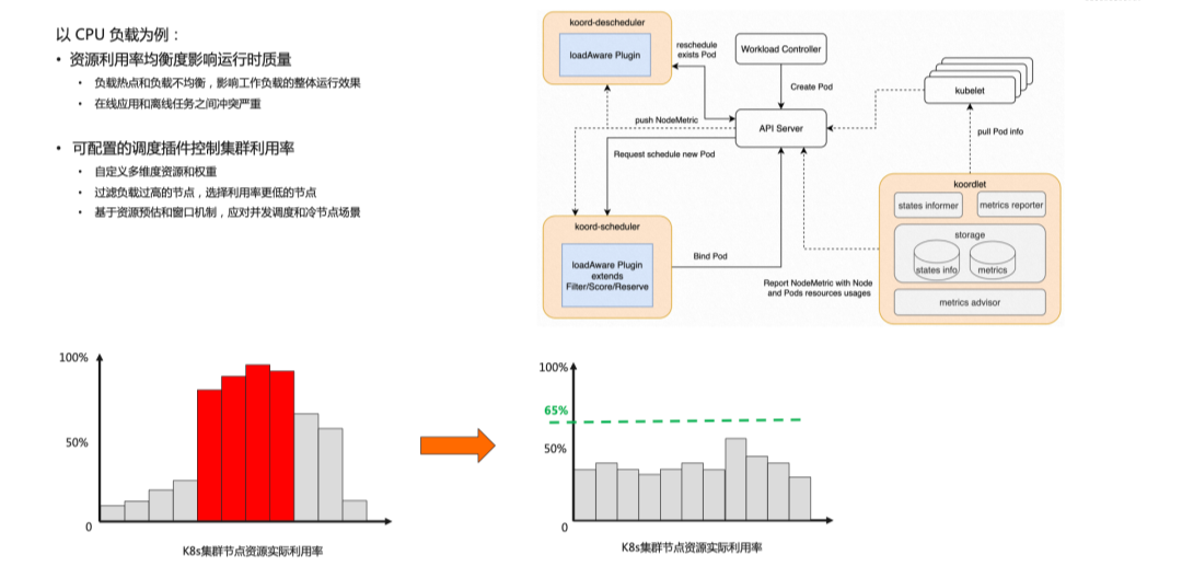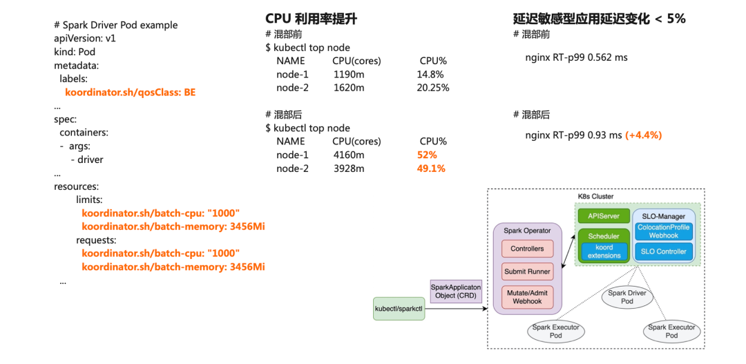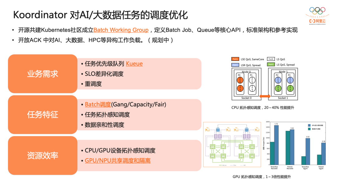 在测试的 ACK 集群上,有两个 8 核 8G 工作节点。每个节点已经部署一个 Nginx 测试应用。我们把 Spark 任务以混部的方式提交到集群上。这里通过 metadata 指明了其 qosClass 为 BE,也就是 BestEffort,。并通过扩展资源描述了其资源申请和限额。通过混部,我们可以看到,系统 CPU 利用率从不足 20%提升至近 50%;而且测试应用的响应延迟只增加了 4.4%。Koordinator 可以在保障延迟敏感型应用的 QoS 前提下,实现资源利用率提升。此外,在 K8s 集群中的工作负载是持续变化、弹性伸缩的。随着时间的推移,集群的资源分配状态可能会失去平衡,比如可能出现部分负载热点,可能导致应用运行延迟大幅增长。以 CPU 负载为例,Koordinator 提供了 CPU 负载感知的调度能力,让 Kubernetes 调度意识到资源分配和实际资源利用率之间的差距,在调度打分阶段进行综合的决策,避免将负载调度到热点的节点上导致雪崩。同时,为了持续的保障节点负载均衡,Koordinator 吸纳了社区的经验,为用户提供了下一代可扩展的重调度框架,同时提供了缺省的负载感知重调度策略,持续的驱动集群的负载编排向优化目标靠拢。下图显示了经过 Koordinator QoS 感知调度和重调度,集群中节点资源实际利用率相对均衡,消除了热点。越来越多的 AI/大数据应用,希望通过容器化来简化管理、提升弹性、优化资源利用率。过去 K8s 主要面向 Stateless 和 Stateful 应用,对计算任务类应用支持有限。阿里云团队和 K8s 社区展开了很多合作,完善了 Scheduler framework 并提供了一些关键的调度插件,来满足计算任务类应用对资源效率、任务特征、业务需求等的特殊性。目前,Kubernetes 社区成立 Batch Working Group,我们也一起定义 Batch Job、Queue 等核心 API、标准架构和参考实现。我们也计划通过 Koordinator 中开放 ACK 产品中对 AI、大数据、HPC 等异构工作负载的支持。在 ACK 中,通过 CPU 拓扑感知调度,在内存密集型任务场景,相比于社区方案有 20%~40%的性能优化,在 AI 分布式训练任务,调度器针可以自动选择最佳多 GPU 卡间互联拓扑,提供最大通信带宽,提升计算效率。对 ResNet、VGG 等典型 CV 类模型训练有 1~3 倍加速。