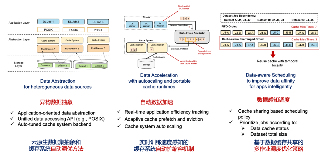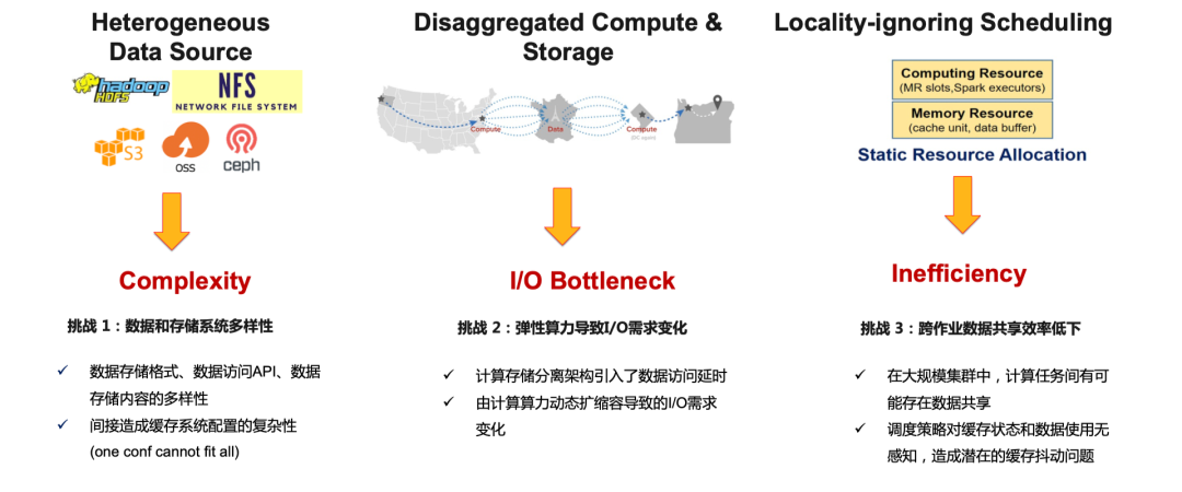 除了调度之外,AI,大数据,HPC 等数据密集型应用云原生化,还有一些技术挑战有待解决,具体来说:- 异构数据源带来的多样性挑战:企业中不同应用所依赖的存储实现各不相同,有 HDFS、NAS、S3/OSS等等;其数据访问的 I/O 特性也不同,比如随机读海量小文件和顺序读大文件。随着业务场景的发展,经常需要联合处理来自不同的存储系统的数据,这样带来了异构数据源访问的复杂性。