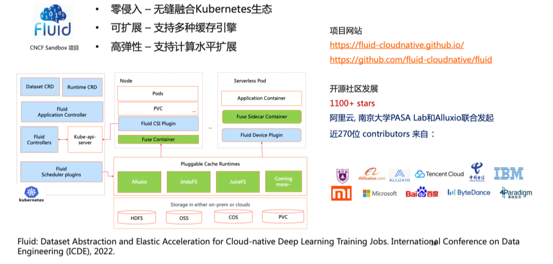 Fluid 是阿里云容器服务团队和南京大学、Alluxio 联合发起的开源项目,目前是 CNCF 托管的 Sandbox 项目,并且在 ACK 上也有对应的产品能力。主要由阿里云容器服务团队维护。另外 Fluid 也得到了也得到许多业界同行的支持,像中国电信、SAP、百度云、腾讯云都在积极贡献。- 零侵入 – 无缝融合 Kubernetes 生态;
