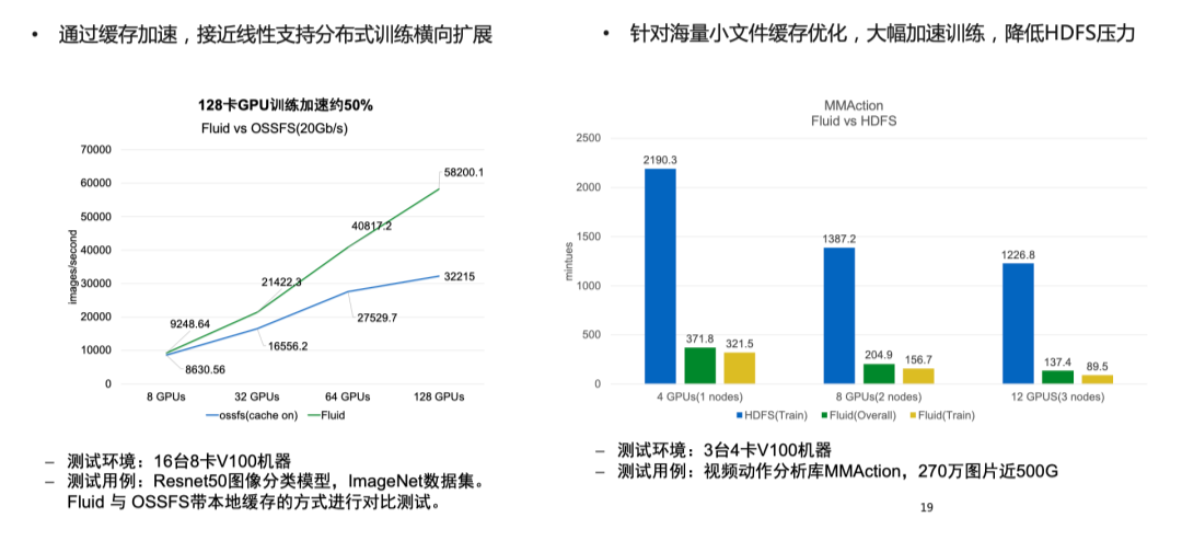 如果大家有兴趣可以进一步了解 Fluid 背后设计的思想的一些探索,相关论文已经被 ICDE 接收,欢迎查阅。这个领域也是非常新的一个领域,希望大家能够一起在社区参与创新。比如在 Resnet50 图像分类模型训练中。如果直接使用 OSSFS 进行数据访问,在多机训练环境中会受到 OSS 总带宽的限制,训练性能出现衰减。利用 Fluid 缓存加速支持分布式训练,可以实现接近线性的横向扩展能力。与原方案相比,在 16 台 128 卡环境下,性能提升 80%。在微博测试场景中,Fluid 针对海量小文件缓存优化,可以大大降低 HDFS 压力,训练速度提升 9 倍。