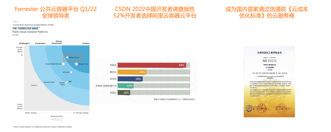 2022 年 1 季度,在权威咨询机构 Forrester 发布的公共云容器平台分析师报告中,阿里云容器服务 ACK 成为比肩 Google 的全球领导者,这也是首次有中国科技公司进入容器服务领导者象限。在 2022 年 8 月,CSDN 2022 中国开发者调查报告中,52%开发者选择阿里云容器云平台。今年 5 月阿里云凭借在云上成本管理的产品能力,以满分的成绩通过了全部 33 个能力指标,成为国内首家通过信通院《云成本优化标准》的云服务商。非常期待与大家共同探索,利用云原生 FinOps 产品能力和技术,助力企业实现高效用云。