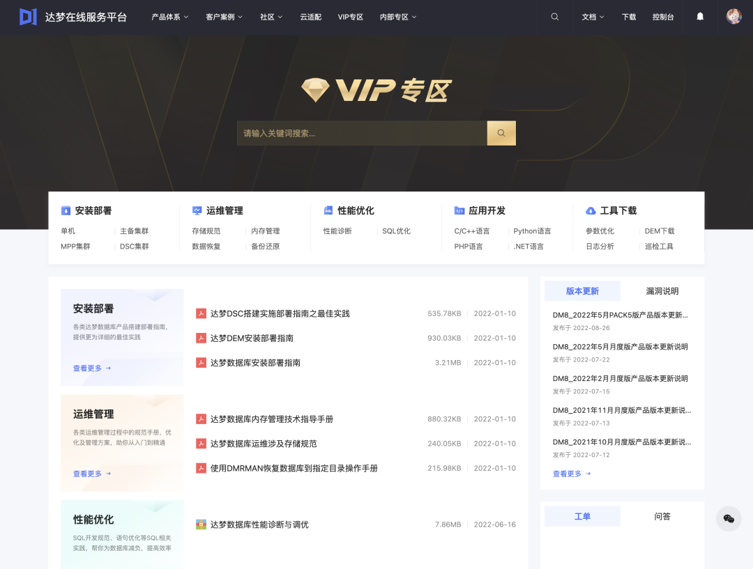 本次重磅更新的【VIP专区】,为已购买达梦数据库的用户提供全周期的售后服务,也是官方唯一在线售后服务入口。正版客户扫描授权卡上的二维码即可注册认证。