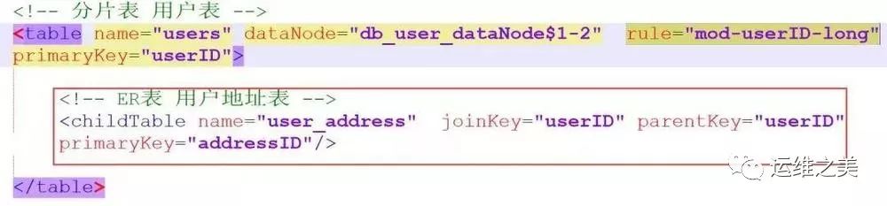这样一种表分组的设计方式是解决跨分片数据 join 的一种很好的思路,也是数据切分规划的重要一条规则。ER 表中在 schema.xml 中使用<childTable>标签进行描述和定义,如图六: