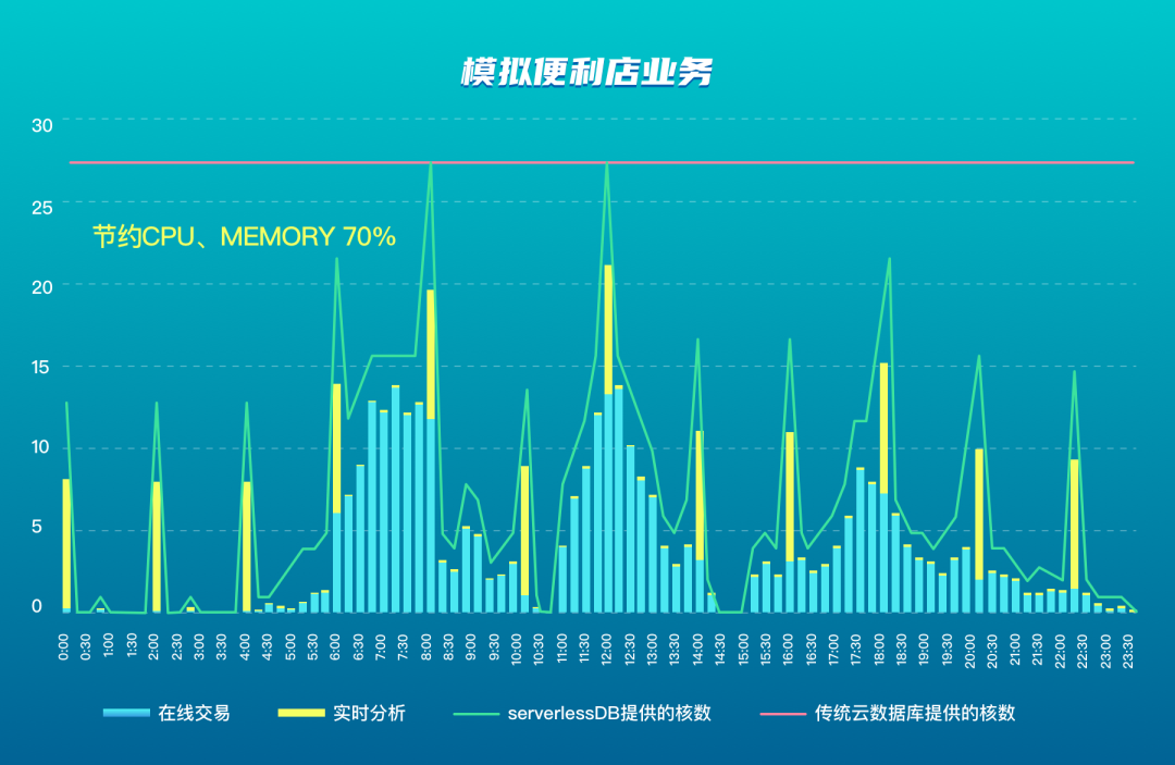 适用于在 HTAP 业务下,业务负载有明显的波峰波谷的场景。既减少了用户成本,又可以实现 TP 业务与 AP 业务之间互不影响,模拟便利店场景,可节约 CPU、MEMORY 资源使用70%左右。