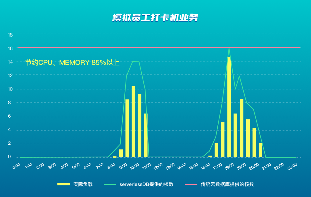 正在运行的应用负载,每天或每年都会有高峰和低峰,例如员工打卡、电商网站等。模拟员工打卡场景,可节约 CPU、MEMORY 资源使用85%以上。