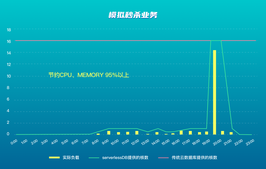 通过 Serverless 方式,可以实现以上场景下成本减少80%左右大部分使用数据库场景下平均可节约 CPU、MEMORY 资源使用80%。