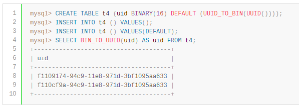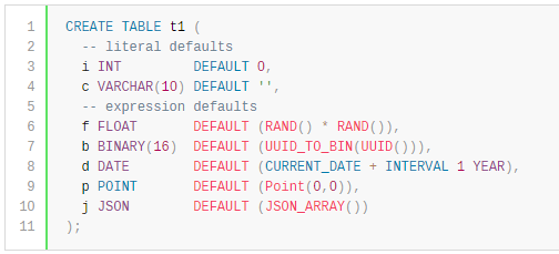 对于CREATE TABLE ... LIKE 和 CREATE TABLE ... SELECT语句,则目标表将保留原始表中的表达式默认值。