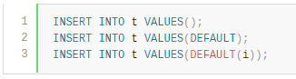 在本例中,i没有显式默认值,因此在严格模式下,下面的每个语句都会产生一个错误,并且不会插入任何行。不使用严格模式时,只有第三条语句产生错误;前两条语句插入隐式默认值,但第三条语句失败,因为DEFAULT(i)无法生成值: