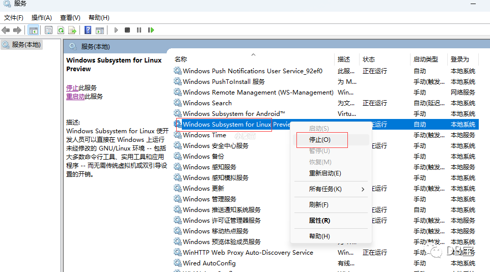 因此,打开服务管理控制台,突出显示“Windows Subsystem for Linux Preview”服务,然后从右键单击上下文菜单中选择“停止”。