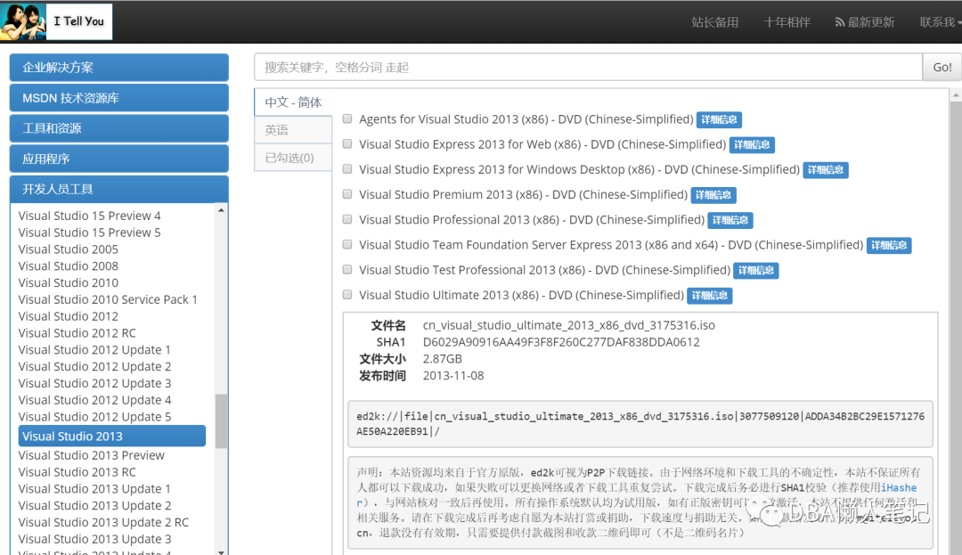 网址:https://msdn.itellyou.cn/下载链接:ed2k://|file|cn_visual_studio_ultimate_2013_x86_dvd_3175316.iso|3077509120|ADDA34B2BC29E1571276AE50A220EB91|/