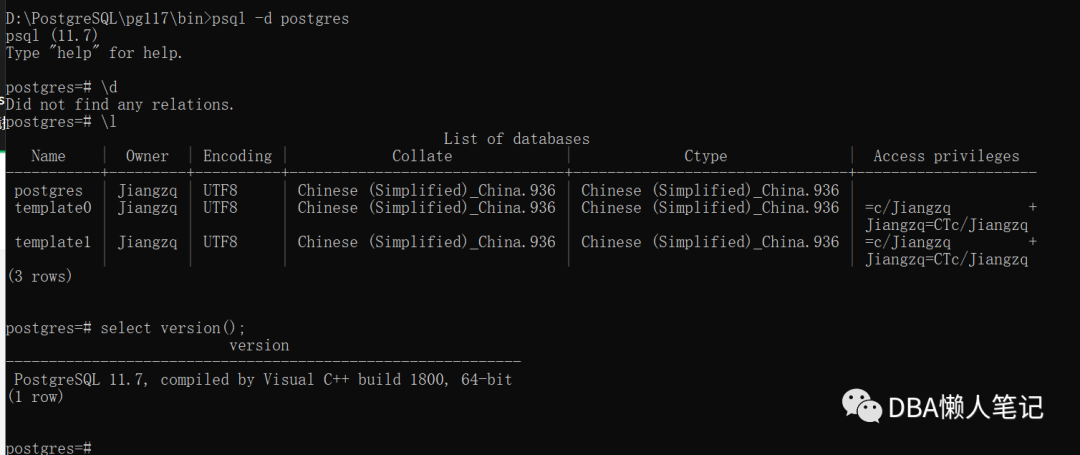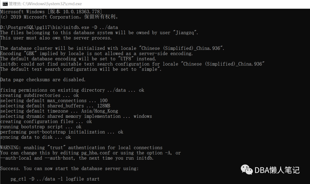 initdb.exe -D ../data 此处默认创建的数据库名称为postgres,默认用户为当前windows登录用户,可以手动指定的,和linux中一样