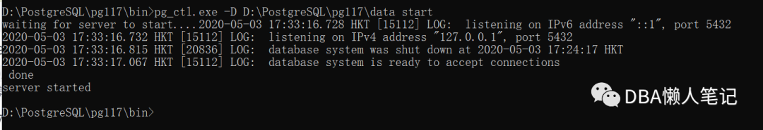 pg_ctl.exe -D D:\PostgreSQL\pg117\data start (本地有多个环境,所以这边指定了data目录)