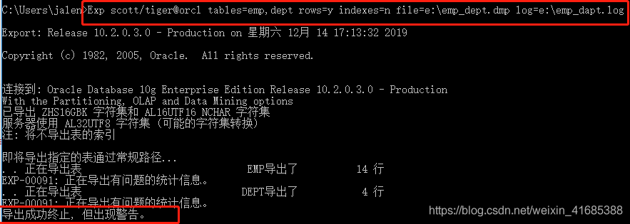 语句:Exp scott/tiger@orcl tables=emp,dept rows=y indexes=n file=e:\emp_dept.dmp log=e:\emp_dapt.log