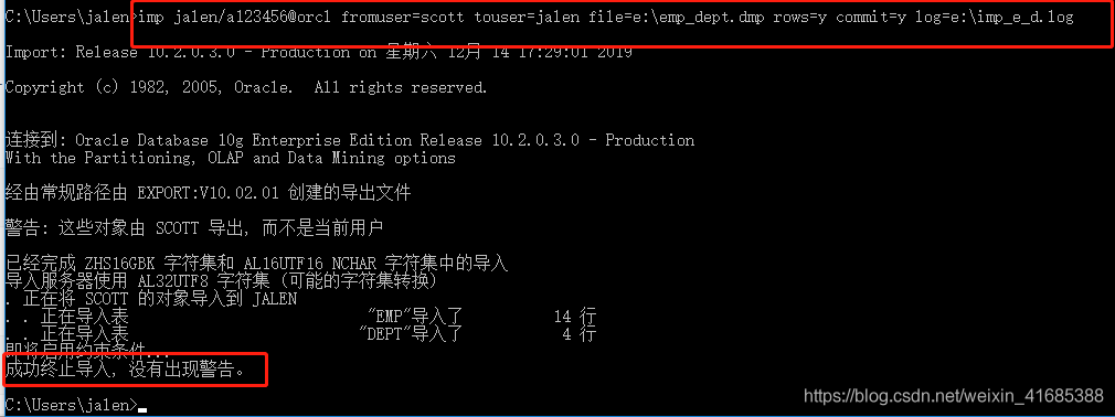 语句:imp jalen/a123456@orcl fromuser=scott touser=jalen file=e:\emp_dept.dmp rows=y commit=y log=e:\imp_e_d.log