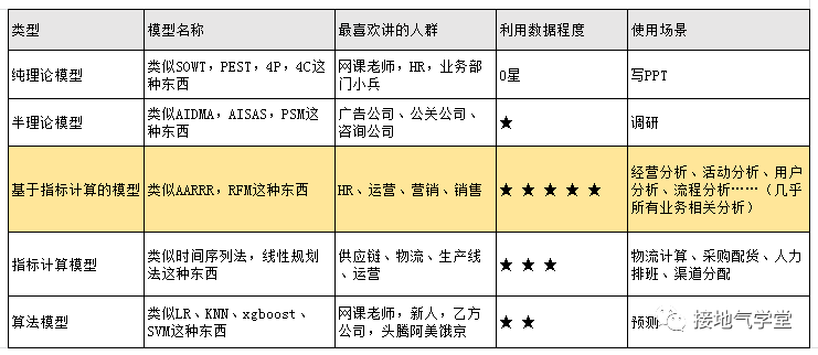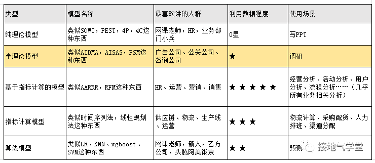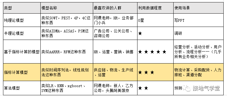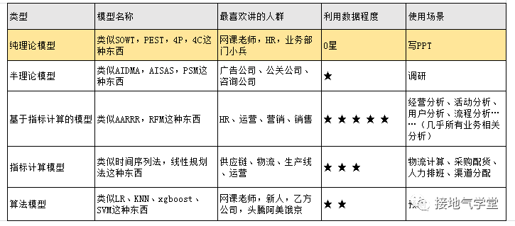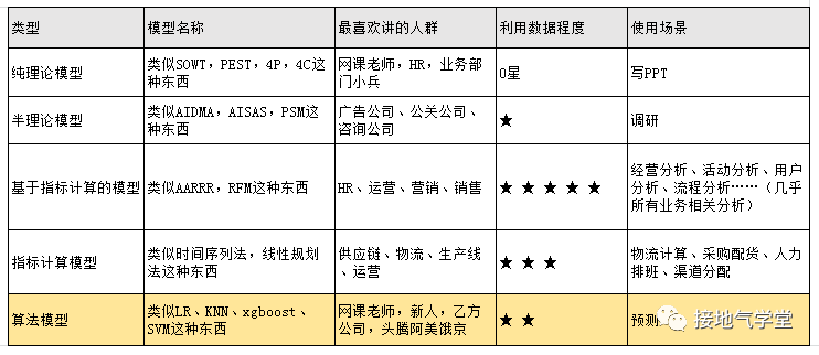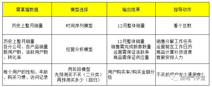 这样直观对比,就能看出来,为啥统计学/机器学习算法模型,在实际场景中运用很少。这些模型需要的数据多,需要的数据颗粒度细,建模过程复杂,输出的结果反而更简单,业务看了能干的事也少。