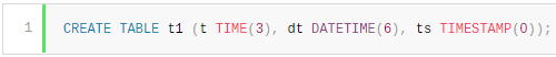 对于TIME, DATETIME和 TIMESTAMP值,MySQL支持小数秒,精度可达微秒(6位数)。要定义包含小数秒部分的列,请使用语法type_name(fsp),其中type_name是TIME、DATETIME或TIMESTAMP,fsp是小数秒精度。例如: