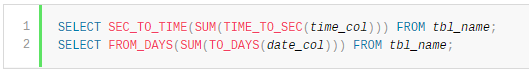 SUM()和AVG()聚合函数不能处理时间值。(它们将值转换为数字,将丢弃第一个非数字字符之后所有内容。)若要解决此问题,请转换为数字单位,执行聚合操作,然后转换回时间值。示例: