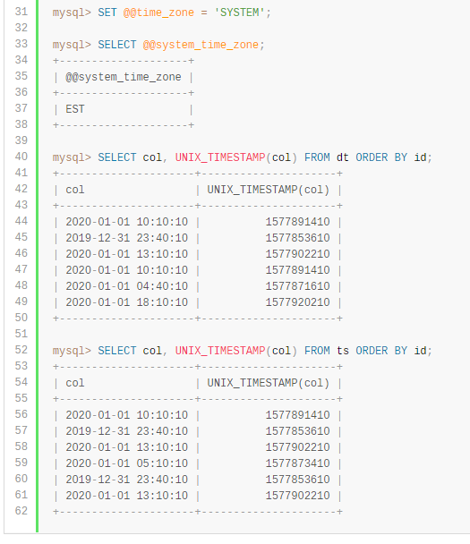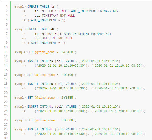 此示例演示如何使用不同的时区设置将带有时区偏移的日期时间值插入TIMESTAMP和DATETIME列,然后检索它们: