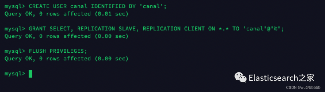 CREATE USER canal IDENTIFIED BY 'canal';GRANT SELECT, REPLICATION SLAVE, REPLICATION CLIENT ON *.* TO 'canal'@'%';-- GRANT ALL PRIVILEGES ON *.* TO 'canal'@'%' ;FLUSH PRIVILEGES;