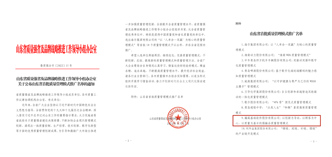 为引导和激励广大市场主体进一步加强质量管理创新,全面提升全省质量管理水平,山东省质量强省及品牌战略推进工作领导小组办公室下发《山东省质量强省及品牌战略推进工作领导小组办公室关于公布山东省首批质量管理模式推广名单的通知》,在全省质量管理优秀单位中评选包括瀚高基础软件股份有限公司的“以创新为导向,以顾客为中心,以质量为基石的强融合质量管理模式”在内的首批10个质量管理模式予以公布并推广。