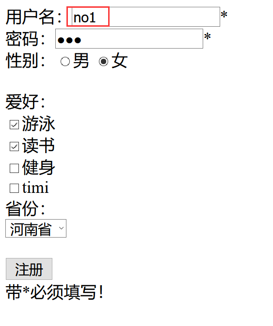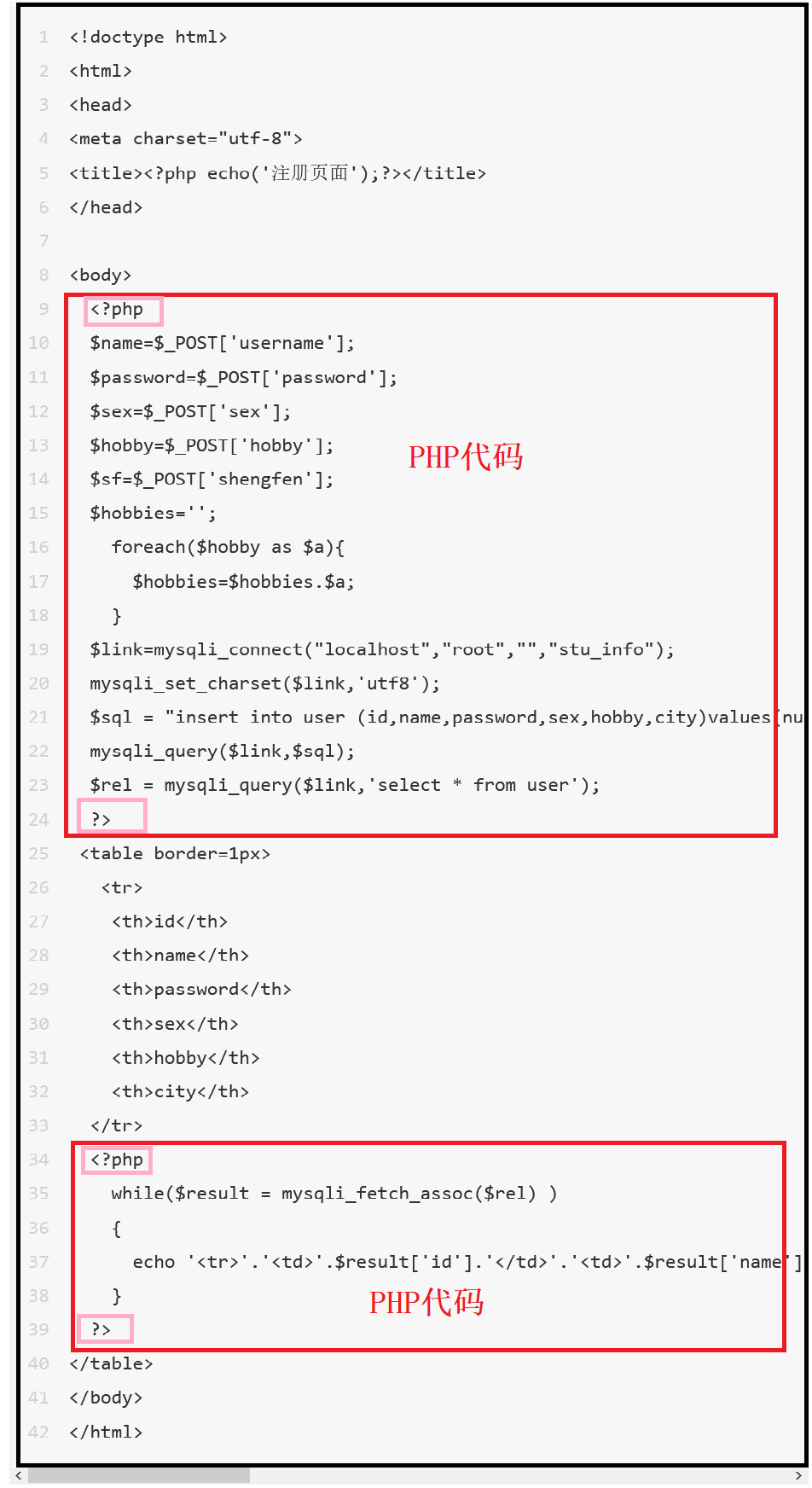 <!doctype html><html><head><meta charset="utf-8"><title><?php echo('注册页面');?></title></head><body><?php$name=$_POST['username'];$password=$_POST['password'];$sex=$_POST['sex'];$hobby=$_POST['hobby'];$sf=$_POST['shengfen'];$hobbies='';foreach($hobby as $a){$hobbies=$hobbies.$a;}$link=mysqli_connect("localhost","root","","stu_info");mysqli_set_charset($link,'utf8');$sql = "insert into user (id,name,password,sex,hobby,city)values(null,'$name','$password','$sex','$hobbies','$sf')";mysqli_query($link,$sql);$rel = mysqli_query($link,'select * from user');?><table border=1px><tr><th>id</th><th>name</th><th>password</th><th>sex</th><th>hobby</th><th>city</th></tr><?phpwhile($result = mysqli_fetch_assoc($rel) ){echo '<tr>'.'<td>'.$result['id'].'</td>'.'<td>'.$result['name'].'</td>'.'<td>'.$result['password'].'</td>'.'<td>'.$result['sex'].'</td>'.'<td>'.$result['hobby'].'</td>'.'<td>'.$result['city'].'</td>'.'</tr>';}?></table></body></html>