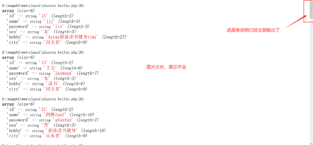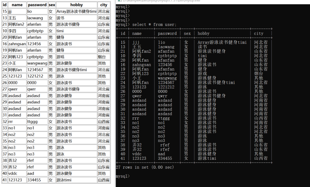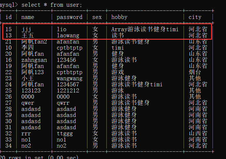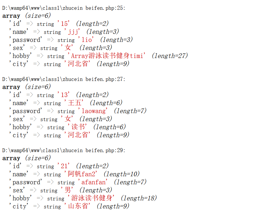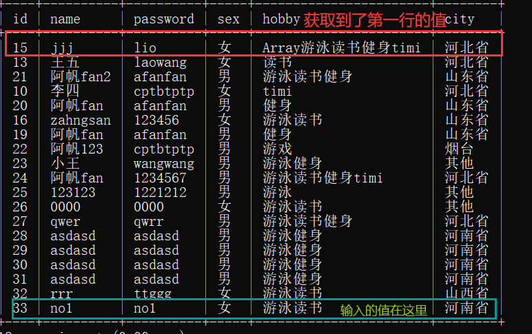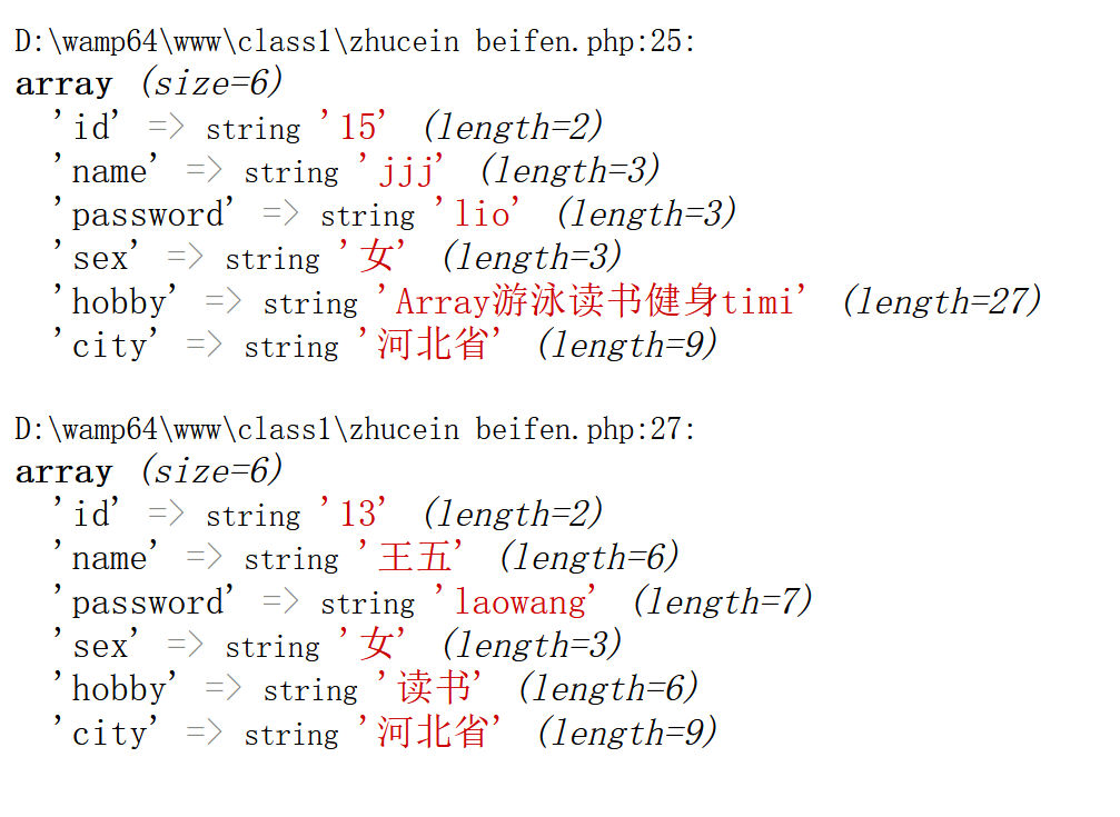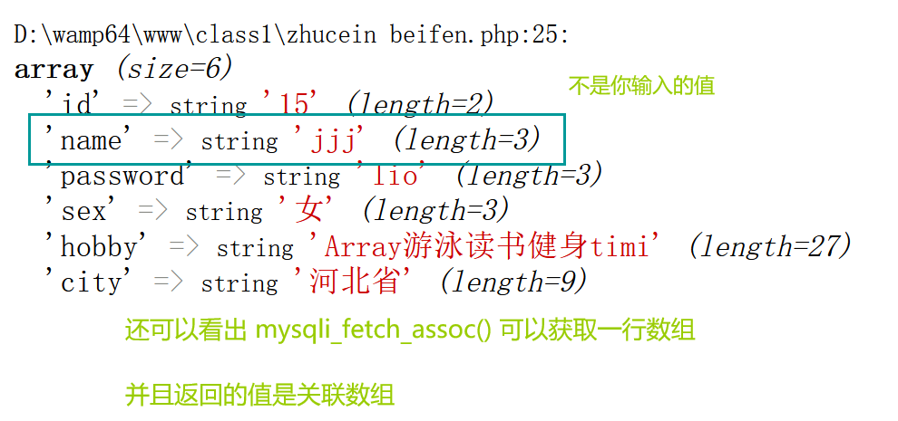 $link=mysqli_connect("localhost","root","","stu_info");mysqli_set_charset($link,'utf8');$sql = "insert into user (id,name,password,sex,hobby,city)values(null,'$name','$password','$sex','$hobbies','$sf')";mysqli_query($link,$sql);$rel = mysqli_query($link,'select * from user');$result = mysqli_fetch_assoc($rel);var_dump($result);$result = mysqli_fetch_assoc($rel);var_dump($result);