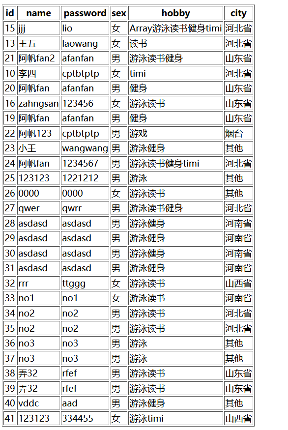 echo '<tr>';echo '<td>';echo $result['id'];echo '</td>';echo '<td>';echo $result['name'];echo '</td>';echo '<td>';echo $result['password'];echo '</td>';echo '<td>';$result['sex'];echo '</td>';echo '<td>';echo $result['hobby'];echo '</td>';echo '<td>';echo $result['city'];echo '</td>';echo '</tr>';