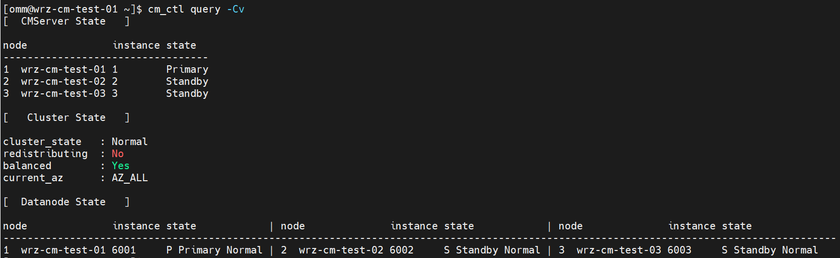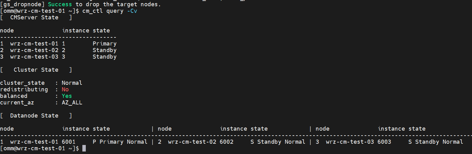 其中当前集群的用户为omm,用户组为dbgrp。为了演示集群的扩容和缩容,我们将对当前集群增加一个节点wrz-cm-test-04完成集群扩容,然后剔除新增的节点wrz-cm-test-04完成集群的缩容。