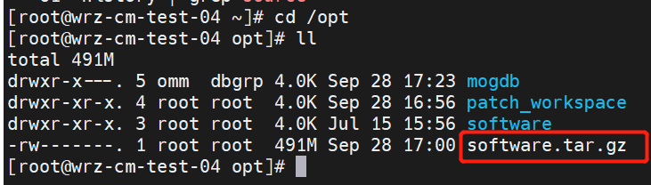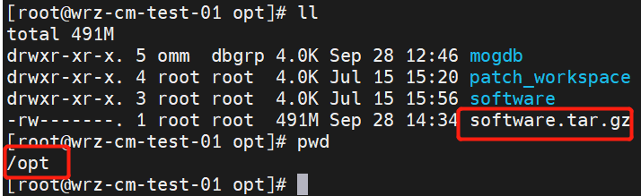 在集群安装的主节点,一般为集群第一个节点(本示例为wrz-cm-test-01)上准备安装包并拷贝至新增节点同样目录下。如下图4所示,主节点目录/opt/software中即为集群安装包,待拷贝至新增节点的安装包文件为/opt/software.tar.gz。