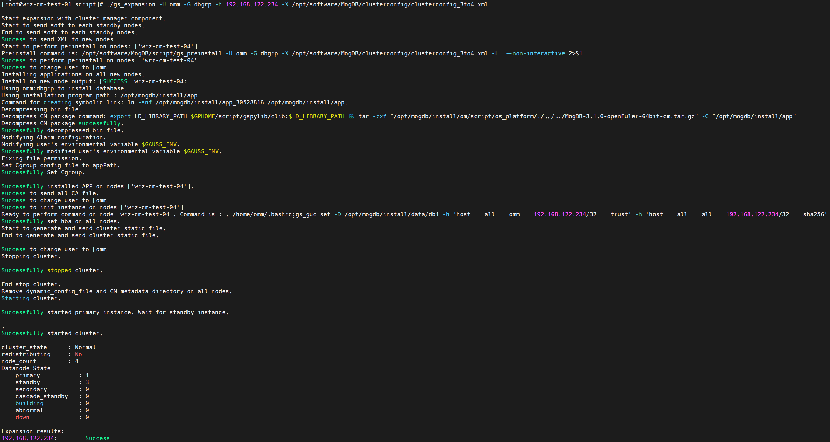 [root@wrz-cm-test-01 MogDB]# ./gs_expansion -U omm -G dbgrp -h 192.168.122.234 -X /opt/software/MogDB/clusterconfig/clusterconfig_3to4.xml