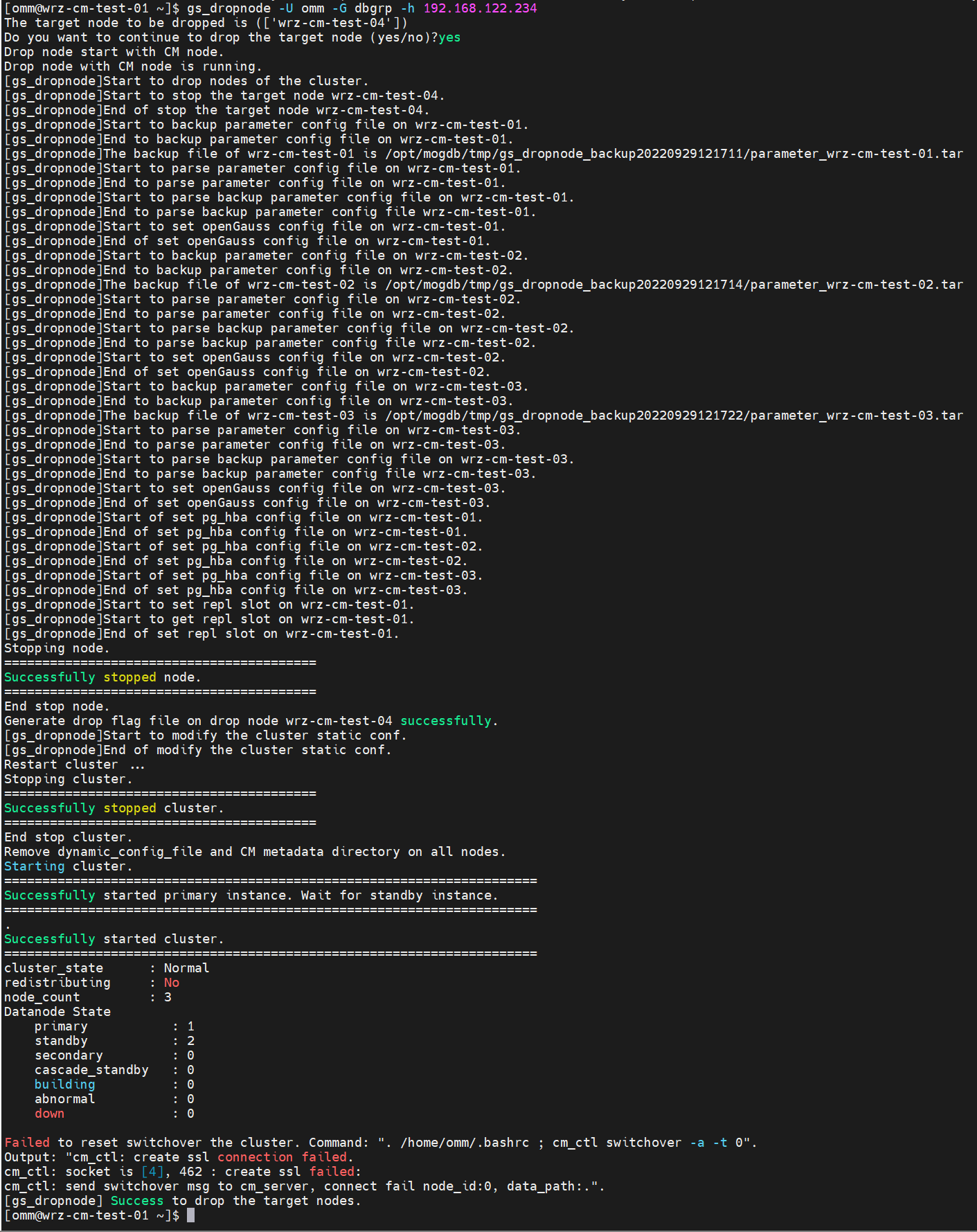 [omm@wrz-cm-test-01 MogDB]# .gs_dropnode -U omm -G dbgrp -h 192.168.122.234