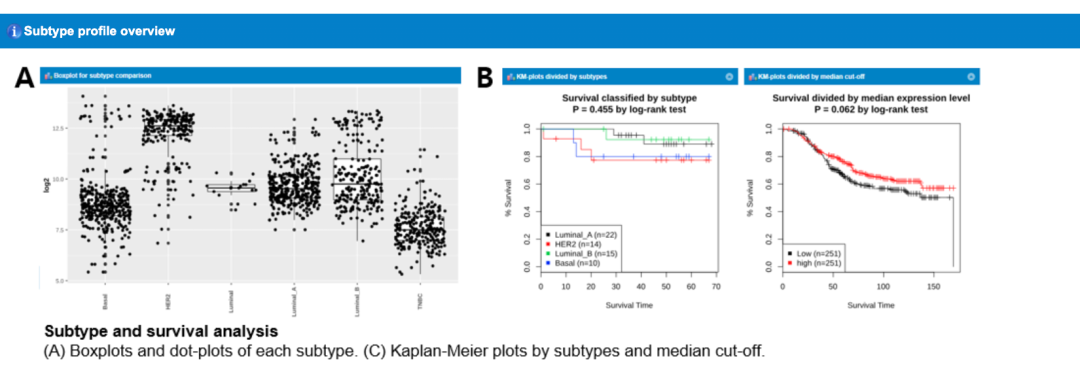 B图第二个是说他在不同的表达水平之间的预后情况,