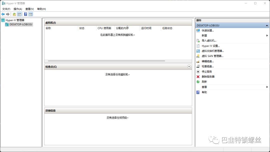 经过前几步的配置后应该可以在Win菜单中搜索到Hyper-V 管理器,打开后界面如下: