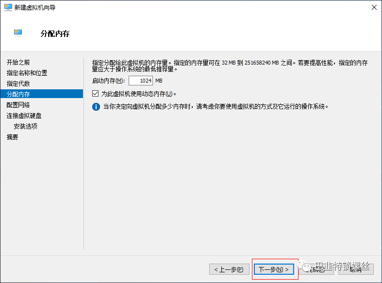 内存先使用默认的1024MB动态内存,后期可以调整内存大小。