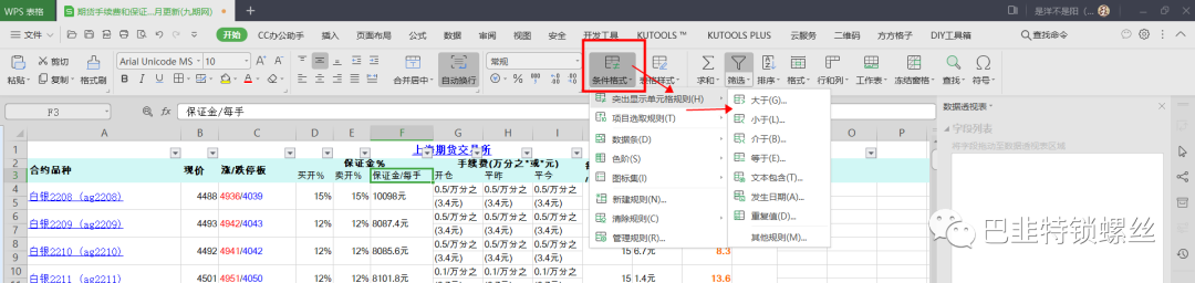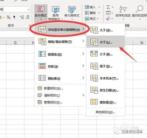 选择“突出选择单元格规则”,点击选择“小于”选项。