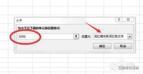 在弹出的“小于”对话框中,输入具体数值,例如“3000”,此外设置此类单元格需要标注的样式,随后点击确定。